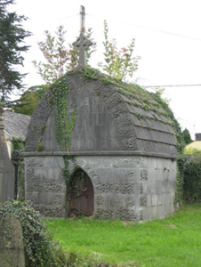 Freestanding mausoleum, erected c.1870. Pitched stone flagged roof with stone Celtic cross finial. Ashlar limestone walls having cut-stone plinth course, cut-stone string course to eaves level, vermiculated quoins, and carved name plaque to front. Vermiculated quoins to sloping sides of gable. Pointed arch entrance with vermiculated stone surround and cast-iron door with strap hinges. Located within grounds of former Catholic parish church.