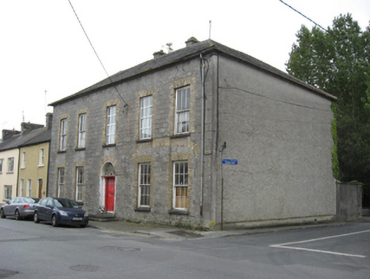 Corner-sited end-of-row five-bay two-storey house, built c.1780, with dormer attic. Sprocketed hipped slate roof with dressed limestone chimneystacks, and cast-iron rainwater goods. Dressed limestone walls to front (north) elevation and east gable, roughcast rendered west gable, and rubble stone walls to rear. Square-headed window openings with yellow brick surrounds, limestone sills and six-over-six pane timber sliding sash windows. Western ground floor windows under common elliptical yellow brick retaining arch. Flat-roofed dormer windows to rear elevation having two-over-two pane timber sliding sash windows. Round-headed door opening with yellow brick voussoirs, stone steps, timber columns on limestone plinths, timber cornice, elaborate cobweb fanlight, and timber panelled door, fronted by two limestone steps. Rubble stone quadrant wall to western boundary of site with rendered piers and double-leaf corrugated-iron gate to yard entrance to rear of house.
