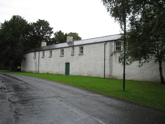 Detached former stableyard, built c.1800, comprising multiple-bay two-storey stable blocks ranged around closed central courtyard with porches to north and east ranges. Lean-to single-storey block to interior of north range. Converted for residential use c.1826. Currently not in use. Hipped slate roofs with roughcast rendered chimneystacks, and with rendered eaves course. Roughcast rendered walls. Square-headed window openings with cut limestone sills, and replacement six-pane timber single and two-light windows. East range has three-over-there pane timber sash windows to first floor, and three-over-six pane and six-over-six pane to ground floor. West range has window openings only to first floor, with three-over-three pane timber sliding sash windows. Square-headed pedestrian and vehicular door openings with replacement timber doors, double-leaf to latter and single-leaf with four-pane overlights to former. Segmental-headed carriage arch with timber battened double-leaf door. Elliptical-headed carriage arch to north elevation, with ashlar sandstone surround having imposts, limestone wheel guards and timber battened double-leaf door. Canted-bay six-over-six pane timber sliding sash window to exterior of south elevation. Gateway to north-east has square-profile dressed limestone piers with pyramidal limestone caps and double-leaf wrought-iron gate.