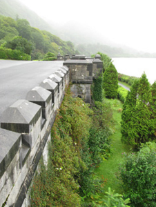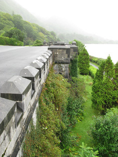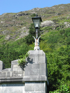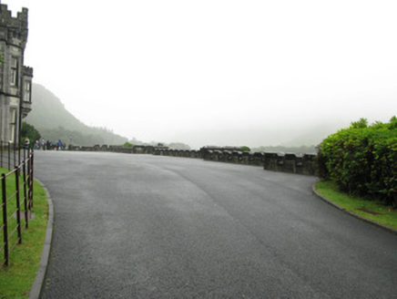 Built at the same time as Kylemore Abbey, this imposing section of crenellated wall forms a key part of the setting of the country house. Its battered walls of well-crafted limestone masonry with good cut-stone details, carved panels, and cast-iron lamps enhances its architectural and aesthetic value.