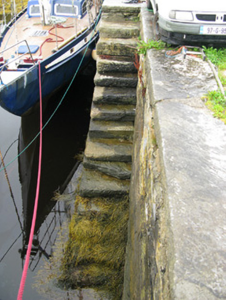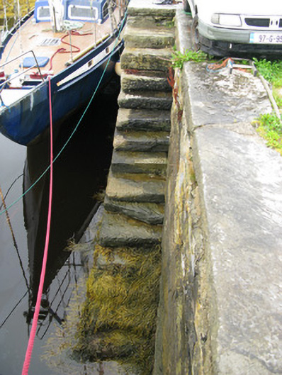 Freestanding quay, built c.1860. Dressed limestone rubble walls with limestone coping stones and rubble stone core incorporating bedrock. Limestone flag steps set into east and west elevations. Gravel surface with tooled limestone mooring posts.