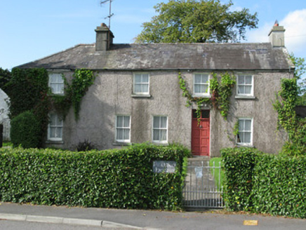 Detached L-plan two-storey former dispensary, built c.1860, having four-bay first floor and five-bay ground floor, single-bay return to south end with flat-roofed canted former window, and having single-storey lean-to additions to rear. Now in use as private house. Hipped slate roof, pitched to north end, and single-pitch slate roofs to additions, with rendered chimneystacks, cast-iron and replacement uPVC rainwater goods. Roughcast rendered walls to front and south elevations, smooth rendered elsewhere. Square-headed window openings throughout with limestone sills having two-over-two pane timber sliding sash windows to front elevation and replacement uPVC windows elsewhere including canted-bay. Square-headed door opening to front having raised reveals, replacement timber panelled door and two-pane overlight, square-headed replacement uPVC door to rear, square-headed replacement uPVC door to canted bay. Three-block barn to south-west having pitched slate and single-pitch corrugated-steel roofs. Rubble stone enclosing wall with limestone gate piers and recent sheet-metal gates.