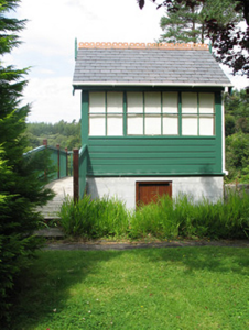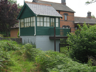 Detached two-storey signal box, erected 1895, now used as outbuilding in grounds of private house. Pitched slate roof with decorative tiled ridge, decoratively carved timber bargeboards with timber finials to gables, and replacement uPVC rainwater goods. Lined and ruled render to ground floor with steel casing in south-east elevation still present for signal mechanism. Horizontal timber lapped boarding to upper floor, with fixed timber-framed ribbon windows to each elevation. Glazed timber door to first floor of north-west elevation with recent timber balcony and ramp giving access. Replacement timber battened door to ground floor of south-east elevation.