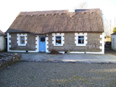 Detached four-bay single-storey vernacular house, built c.1800, having late twentieth-century flat-roofed extension to rear. Pitched reed thatched roof with raised scolloped ridge, thatch being brought lower over entrance to provide additional shelter. Low rendered chimneystack. Walls have a slight batter and front elevation is covered with applied water-weathered stones. Square-headed openings with painted block-and-start surrounds to front. Replacement timber windows, limestone sills, and glazed timber door. Single-storey outbuildings to east and west with rubble limestone walls and tiled roofs.