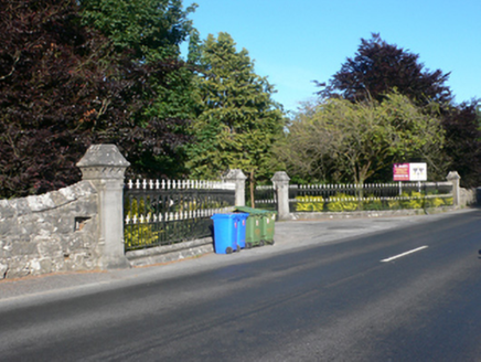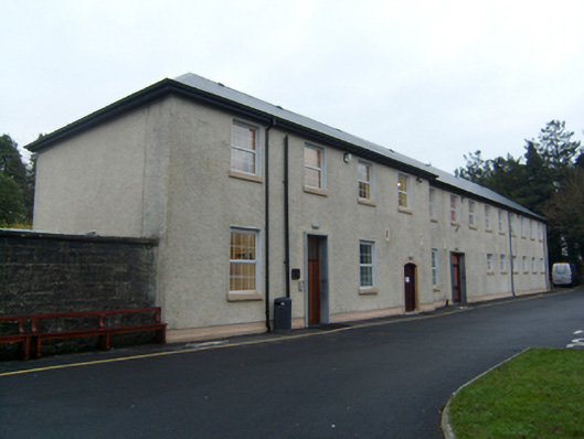 Pair of detached fourteen-bay two-storey workhouse buildings, built c.1860, now in use as school, blocks connected by ashlar stone wall with single-storey pitched roof former dining hall, and with two-storey extension to rear of north-west block at right angles. Hipped slate roof, replacement slate to south-east block, and cast-iron rainwater goods. Roughcast rendered walls with render skirting above painted draughted and pecked stone plinth. Square-headed window openings with slim rendered reveals, painted sills and replacement uPVC windows throughout. Square-headed entrance opening to central bay of each block with bullnosed splayed limestone surrounds. Segmental-headed timber sheeted door to south-east block with draughted and pecked limestone surround. Single-storey squared and snecked limestone wall with flat stone copings and central segmental arch with draughted and pecked stone surround joining both blocks. Three-bay rendered gable-fronted former dining hall with bellcote to gable perpendicular to schoolhouse blocks, having pitched slate roof, replacement uPVC rainwater goods, square-headed openings, replacement uPVC windows throughout and segmental-headed timber entrance door to south-west gable with painted stone surround. Set back from road with mature gardens to front and rear, and having two single-storey outbuildings to rear. Square-plan gate piers with trefoil motif, cantoned columns and chamfered pier cap flanked by decorative cast-iron railings with fleur-de-lys motif set on rendered plinth with chamfered copings.
