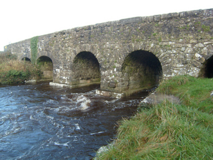 This early nineteenth-century road bridge forms an imposing feature of the N63 road spanning the River Abbert near Abbeyknockmoy. There is evidence of early repairs and extensions as the road network throughout the county was improved. Its simple detailing exhibits evidence of local craftsmanship and materials and exhibits good quality traditional stone masonry.