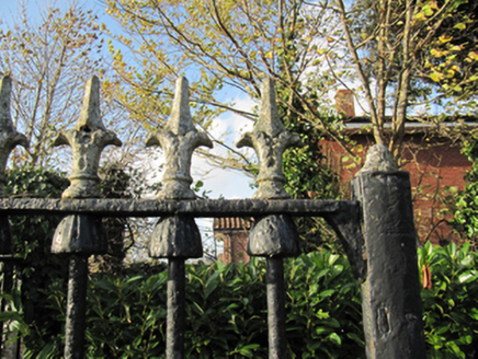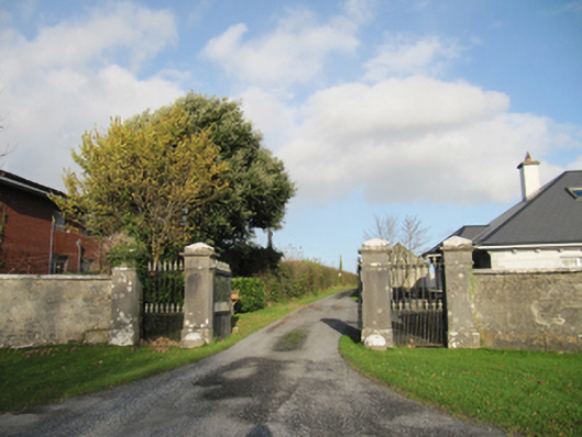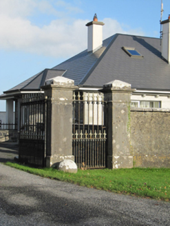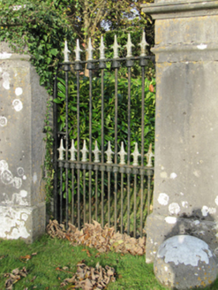 Entrance gates to Rathmore House, erected c.1780, comprising double-leaf decorative cast-iron vehicular gate flanked by cut and tooled limestone square-plan piers with plinths, imposts, cornice and spyramidal caps, in turn flanked by matching pedestrian gates and piers, with partly rendered rubble quadrant walls having matching terminating piers. Spherical tooled limestone wheel guards. Refurbished former gate lodge to east.