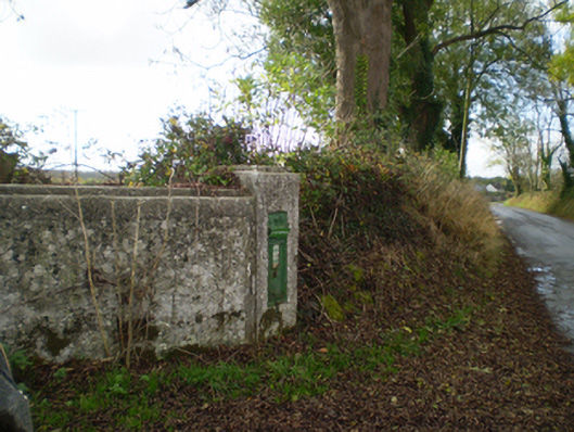 Wall-mounted cast-iron post box, c.1905, with 'ER VII' royal cipher and raised crown motif. Now disused. Raised 'Post Office' lettering to letter flap and foundry name to the base (now illegible). Set into rendered gate pier at former entrance to Greenfield House, adjacent to rural road junction.