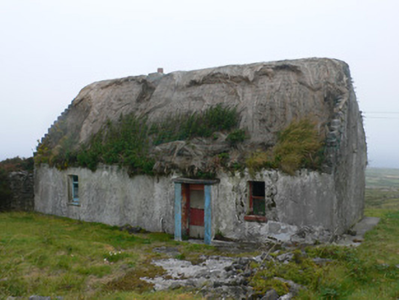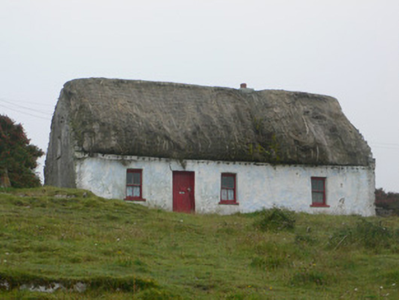 Detached four-bay single-storey vernacular house, built c.1800, having attic, and with opposed doors in long walls. Pitched roped thatch roof with crow-stepped gables, and low rendered chimneystack. Rendered walls. Square-headed window openings with two-over-two pane timber sliding sash windows to front and fixed two-pane and replacement timber windows to rear, all with painted sills. Square-headed door opening with replacement timber door. Rear timber battened door set into windbreak with concrete sides and flat roof. Ruined outbuilding to west gable.