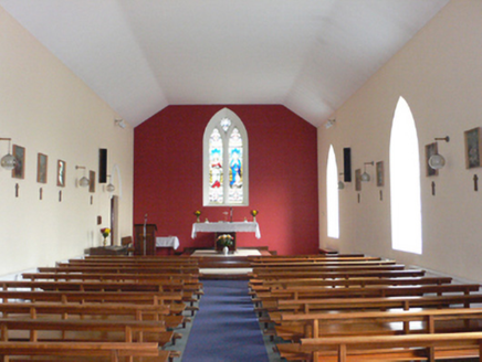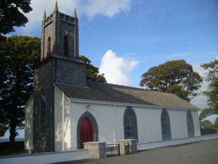 Freestanding single-cell Roman Catholic church, built c.1820, having four-bay south elevation, blank north elevation, altar to east end, two-stage square-plan stepped profile tower to west end, and recent flat-roofed sacristy to north elevation. Pitched tiled roof with cast-iron cross finial to east gable. Tower projects slightly from west gable with upper stage having pointed pinnacles atop corner pilasters. Limestone ashlar walls to tower, and roughcast rendered walls to rest of building, having smooth rendered plinth course. Pointed arch window openings with stained glass, cut limestone surrounds, chamfered to south elevation, and having Y-tracery to east gable. Pointed arch openings to sides of top stage of tower, with timber louvres. Pointed arch doorway to west end of south elevation, having chamfered limestone surround and double-leaf glazed timber door. Interior entered through tower which has round arches to each side and walling above that is corbelled out. Stained-glass windows, print Stations of the Cross, and brass plaques to nave. Double-leaf cast-metal gate to road, set to tooled limestone piers having render capping, and roughcast rendered boundary walls. Tooled limestone cross to graveyard possibly originally from church. Graveyard to east of church.