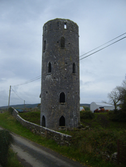 This impressive eye-catcher was formerly part of Castleboy house demesne, demolished when the Land Commission broke up the Persse estate and ran a public road through it to facilitate new farms and housing. The tower makes a strong impression in the landscape and its façade is enlivened by tooled stone detailing.