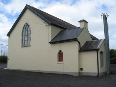 Detached single-cell Roman Catholic barn church, built c.1800, entrance facing north-west, having three-bay nave, gabled porch to north-west gable, and lower gabled sacristy to east end of north-east long wall, with further lower gabled annex, and attached mild steel belfry. Pitched slate roofs, with terracotta ridge crestings to nave and porch, and some cast-iron rainwater goods. Lined-and-ruled rendered walls and rendered plinth course, having crufifision plaque to north-west end of nave. Pointed arch window openings, double-light to nave and triple-light to altar gable, having painted masonry block-and-start surrounds, sills and Y-tracery. Cut limestone quatrefoil window to gable wall of porch. Interior has open timber A-frame roof, timber gallery, carved marble altar furniture, and stained-glass windows. Calvary to west of church. Rubble stone and moulded concrete block boundary walls.