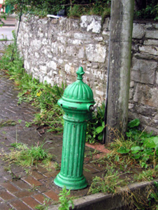 Cast-iron water pump, c.1870, comprising fluted cylindrical shaft with raised horizontal banding and fluted domed cap with acorn finial. New tap fitted. Set on side of road.