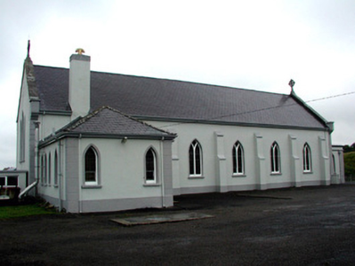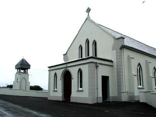 Detached single-cell Roman Catholic church, built c.1930, with six-bay nave, projecting porch and sacristy. Freestanding bell tower to south-west. Pitched slate roof with stone cross finials to gable ends. Flat felt roof to porch and hipped slate roof to sacristy with rendered chimneystack. Ruled-and-lined render to walls, plinth course and quoins. Cornice to porch. Buttresses divide window openings. Pointed traceried windows with stained glass and traceried lancets with stucco surrounds and stone sills. Drop-arched door opening with moulded surround, hood moulding and timber battened double doors with limestone threshold. Bell tower has masonry structure and pyramidal slate roof.