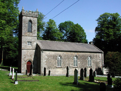 Detached single-cell Church of Ireland church, built in 1817 by John Godley, with three-bay nave, three-stage tower to the west and single-storey vestry. Pitched tiled roof to nave with stone chimneystack, limestone eaves course and cast-iron rainwater goods. Random coursed stone walls with tooled quoins and rendered pediment to east end. Pointed-arched window openings have tooled limestone surrounds and sills and decorative paired and traceried timber sash windows. Pointed-arched door opening to tower with tooled stone surround, timber battened double door and stone threshold. Door to sacristy has a red brick flat-arch. Castellated three-stage tower with pinnacles and string courses to first and second stage. Graveyard with grave markers dating from early-eighteenth century to present. Site enclosed by rendered wall and cast-iron gates flanked by carved stone piers.