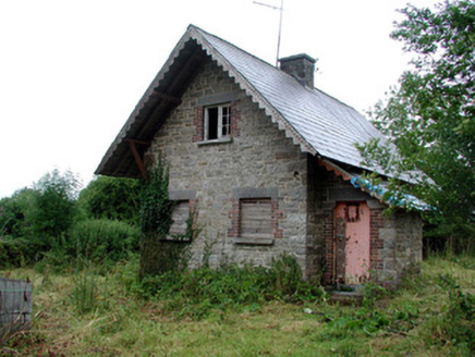 Detached two-bay single-storey with attic gable-fronted former gate lodge, built c.1850, now vacant. Pitched slate roof with oversailing eaves, cut stone chimneystack and decorative timber bargeboards. Random coursed stone walls. Tooled limestone lintels to side-sliding timber sash windows with limestone sills and brick surrounds. Projecting lean-to entrance porch to east with shouldered-arched opening with cut stone lintel, red brick surround and timber battened door. Stone outbuilding with pitched slate roof to north-west. Set behind random coursed stone wall with rock-faced cut stone piers to estate.