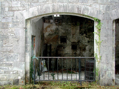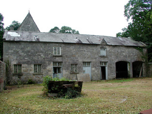 Detached eight-bay two-storey stable block, built in 1833, with stone walls surrounding yard. Currently disused. Pitched slate roof with dormer window below eaves and stone coping to gable ends. Coursed squared cut stone walls with square-headed window and door openings. Timber casement windows with stone sills. Timber and glazed doors with overlights. Pair of segmental-headed carriage openings. Red brick structure with corrugated lean-to roof to north. Cut stone slabs in circular pattern surrounding former well. Random coursed stone wall to garden. Cut stone piers with cast-iron gates give access to site. Subsequent stable block to west.