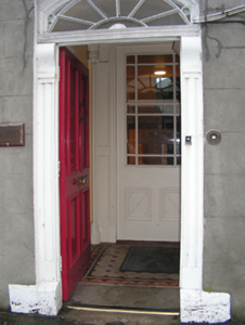 Terraced two-bay three-storey townhouse, extant 1838. Now in alternative use. One of a pair. Pitched slate roof with clay ridge tiles terminating in rendered chimney stacks having shallow capping supporting terracotta or yellow terracotta pots, and cast-iron rainwater goods on rendered cut-limestone eaves[?]retaining cast-iron downpipe. Rendered, ruled and lined walls. Square-headed window openings with drag edged dragged cut-limestone sills, and concealed dressings framing one-over-one timber sash windows retaining three-over-six (top floor) timber sash windows without horns. Segmental-headed door opening with threshold, timber doorcase with panelled pilasters supporting "Cyma Recta" or "Cyma Reversa" cornice on ogee consoles, and concealed dressings framing timber panelled door having fanlight. Interior including (ground floor): vestibule; square-headed door opening into entrance hall-cum-staircase hall with carved timber Classical-style surround framing glazed diagonal timber boarded or tongue-and-groove timber panelled door having overlight; entrance hall-cum-staircase hall retaining carved timber surrounds to door openings framing timber panelled doors, staircase on a dog leg plan with turned timber balusters supporting carved timber banister terminating in turned timber newel, carved timber surrounds to door openings to landings framing timber panelled doors, and run moulded plasterwork cornices to ceilings; and carved timber surrounds to door openings to remainder framing timber panelled doors with carved timber surrounds to window openings framing timber panelled shutters on panelled risers. Street fronted with concrete footpath to front.