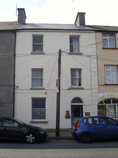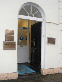 Terraced two-bay three-storey townhouse, extant 1838. Reroofed. Now in alternative use. One of a pair. Replacement pitched artificial slate roof with ridge tiles terminating rendered chimney stacks having shallow capping supporting terracotta or yellow terracotta pots, and cast-iron rainwater goods on timber eaves board on rendered cut-limestone eaves[?]retaining cast-iron downpipe. Rendered, ruled and lined walls with rusticated rendered pier to end. Square-headed window openings with drag edged dragged cut-limestone sills, and concealed dressings framing replacement one-over-one timber sash windows replacing six-over-six timber sash windows. Segmental-headed door opening with concealed dressings framing timber panelled door having fanlight. Interior including (ground floor): vestibule; square-headed door opening into entrance hall-cum-staircase hall with glazed timber panelled door having sidelights below overlight; entrance hall-cum-staircase hall retaining carved timber surrounds to door openings framing timber panelled doors, staircase on a dog leg plan with turned timber balusters supporting carved timber banister terminating in turned timber newel, carved timber surrounds to door openings to landings framing timber panelled doors, and run moulded plasterwork cornices to ceilings; and carved timber surrounds to door openings to remainder framing timber panelled doors with carved timber surrounds to window openings framing timber panelled shutters on panelled risers. Street fronted with concrete footpath to front.