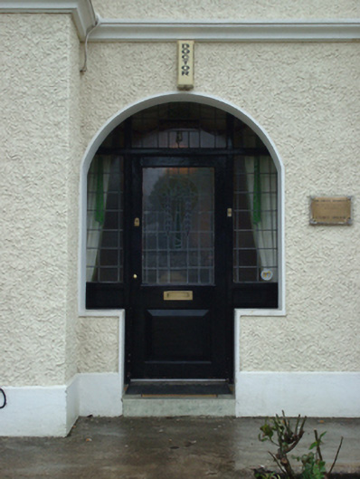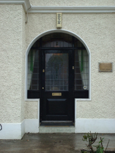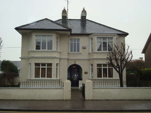 Detached three-bay two-storey house, between 1940-9, on an L-shaped plan with single-bay two-storey advanced end bay; two-bay two-storey side elevations. Sold, 2002, to accommodate alternative use. One of a pair. Hipped slate roof on an L-shaped plan with moss-covered clay ridge tiles, paired rendered central chimney stacks having corbelled stepped capping supporting terracotta pots, and cast-iron rainwater goods on slightly overhanging box eaves retaining cast-iron downpipes. Gritdashed roughcast walls on rendered plinth. Hipped segmental-headed central open internal porch with concrete step threshold. Square-headed door opening with timber mullions supporting timber transom, and concealed dressings framing glazed timber panelled door having stained glass sidelights on panelled risers below stained glass overlight. Square-headed window openings with "Cavetto" sills, and concealed dressings framing timber casement windows. Set back from street in landscaped grounds with rendered piers to perimeter having stepped capping supporting iron gate.
