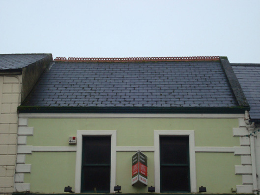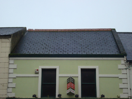 Terraced two-bay two-storey house, rebuilt 1909; extant 1926, with shopfront to ground floor. Reroofed. Replacement pitched artificial slate roof with trefoil-perforated crested terracotta ridge tiles, concrete coping to gables, and uPVC rainwater goods on rendered "Cavetto" cornice retaining cast-iron octagonal or ogee hopper and square profile downpipe. Rendered, ruled and lined walls on rendered chamfered plinth with bull nose-detailed rendered panelled quoins to ends. Rendered shopfront to ground floor including paired segmental-headed door openings, concealed dressings having bull nose-detailed reveals with hood mouldings over on "Acanthus"-detailed label stops. Square-headed window openings (first floor) with concealed sills, and rendered "bas-relief" surrounds having bull nose-detailed reveals framing one-over-one timber sash windows. Street fronted with cobbled footpath to front.