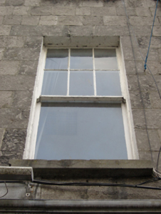 Terraced two-bay three-storey double-pile over basement townhouse, extant 1838, with shopfront to ground floor. In alternative use, 1896. Renovated. One of a terrace of six. Pitched double-pile (M-profile) slate roof with clay ridge tiles, rendered chimney stacks having stepped capping (north) or rendered capping (south) supporting terracotta or yellow terracotta pots, and replacement uPVC rainwater goods on cut-limestone eaves retaining cast-iron hopper and downpipe. Tuck pointed drag edged tooled limestone ashlar wall (upper floor) with drag edged tooled cut-limestone flush quoins to corner. Shopfront to ground floor including pair of segmental-headed door openings with replacement limestone ashlar voussoirs framing replacement timber fittings. Square-headed window openings (upper floors) with drag edged dragged cut-limestone sills, and drag edged tooled cut-limestone block-and-start surrounds centred on keystones framing six-over-one timber sash (first floor) or replacement uPVC casement (top floor) windows. Interior including (ground floor): entrance hall-cum-staircase hall retaining staircase on a dog leg plan with timber "match stick" balusters supporting carved timber banister terminating in timber newel; and (upper floors): carved timber surrounds to door openings framing timber panelled doors with timber panelled shutters to window openings. Street fronted with cobbled footpath to front.