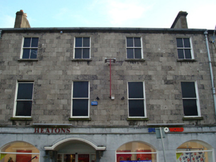 Terraced four-bay three-storey double-pile over basement townhouse, extant 1838, originally two separate two-bay three-storey townhouses. In alternative use, 1890. Renovated with replacement shopfront inserted to ground floor. Two of a terrace of six. Pitched double-pile (M-profile) slate roof with clay ridge tiles, rendered chimney stacks having rendered capping (north) or corbelled stepped capping (south) supporting terracotta or yellow terracotta pots, and cast-iron rainwater goods on cut-limestone eaves retaining cast-iron hoppers and downpipes. Tuck pointed drag edged tooled limestone ashlar wall (upper floors). Square-headed window openings (upper floors) with drag edged dragged cut-limestone sills, and drag edged tooled cut-limestone block-and-start surrounds centred on keystones framing replacement one-over-one (first floor) or two-over-two (top floor) timber sash windows replacing six-over-six (first floor) or six-over-three (top floor) timber sash windows. Interior including (upper floors): carved timber surrounds to door openings framing timber panelled doors with timber panelled shutters to window openings. Street fronted with cobbled footpath to front.