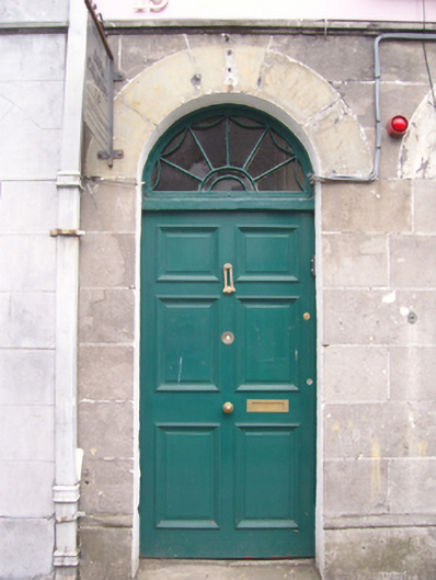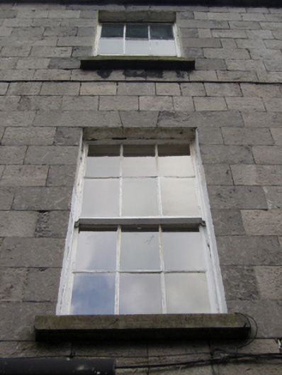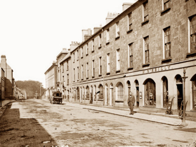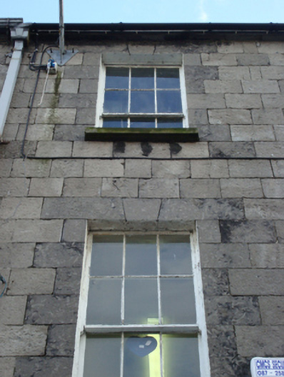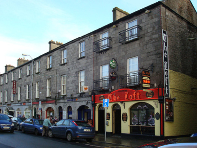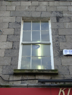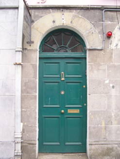 Terraced two-bay three-storey double-pile over basement townhouse, extant 1838, with shopfront to ground floor. One of a terrace of six. Pitched double-pile (M-profile) slate roof with clay ridge tiles, rendered chimney stack having corbelled stepped capping supporting terracotta or yellow terracotta pots, and cast-iron rainwater goods on timber eaves board on cut-limestone eaves retaining cast-iron hopper and downpipe. Drag edged tooled limestone ashlar wall (upper floors). Shopfront to ground floor including pair of segmental-headed door openings with dragged limestone ashlar voussoirs framing timber panelled doors having fanlights. Tuck pointed drag edged tooled limestone ashlar wall (upper floors). Square-headed window openings (upper floors) with drag edged dragged cut-limestone sills, and drag edged tooled cut-limestone block-and-start surrounds centred on keystones framing six-over-six (first floor) or six-over-three (top floor) timber sash windows. Interior including (ground floor): vestibule; square-headed door opening into entrance hall-cum-staircase hall with glazed timber panelled door having overlight; entrance hall-cum-staircase hall retaining staircase on a dog leg plan with timber "match stick" balusters supporting carved timber banister terminating in timber newel; and (upper floors): carved timber surrounds to door openings framing timber panelled doors with timber panelled shutters to window openings. Street fronted with cobbled footpath to front.
