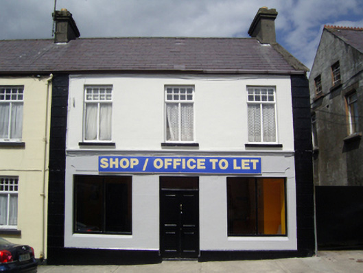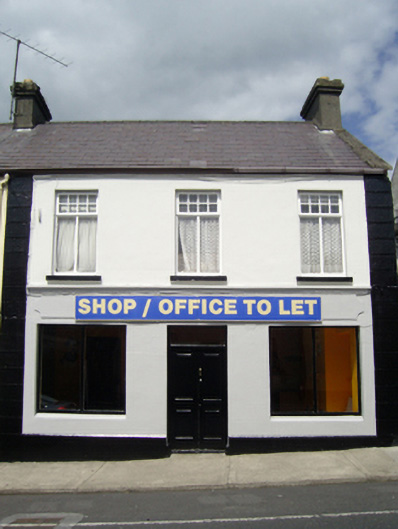 Attached three-bay two-storey house, extant 1926, on a rectangular plan with shopfront to ground floor. Now disused. One of a pair. Pitched slate roof with clay ridge tiles, concrete or rendered coping to gables with rendered chimney stacks to apexes having corbelled stepped stringcourses below capping supporting terracotta pots, and replacement uPVC rainwater goods on eaves boards on rendered eaves retaining cast-iron downpipe. Rendered, ruled and lined walls on rendered chamfered plinth with rusticated rendered piers to ends. Rendered shopfront to ground floor on a symmetrical plan with rendered fascia having "Cavetto" cornice. Square-headed window openings (first floor) with concrete sills, and concealed dressings framing timber casement windows. Street fronted with concrete footpath to front.
