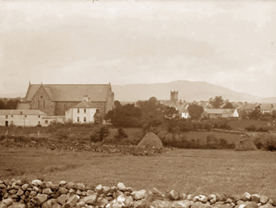 Detached three-bay two-storey parochial house, extant 1893, on a cruciform plan centred on single-bay single-storey gabled projecting porch to ground floor; single-bay (single-bay deep) two-storey lean-to central return (south). Occupied, 1901; 1911. Refenestrated, ----. Now disused. Hipped slate roof on a T-shaped plan centred on lean-to slate roof (north); pitched (gabled) slate roof (porch), lichen-covered clay ridge tiles, paired rendered central chimney stacks having corbelled stepped stringcourses below capping supporting terracotta or yellow terracotta pots, concrete coping to gable, and replacement uPVC rainwater goods on timber eaves boards on chevron- or saw tooth-detailed eaves retaining cast-iron downpipes. Rendered, ruled and lined walls on rendered chamfered plinth with rusticated rendered piers to corners. Camber-headed central window opening (porch) with drag edged cut-limestone sill, and concealed dressings framing replacement uPVC casement window replacing two-over-two timber sash window. Camber-headed window openings (ground floor) with drag edged cut-limestone sills, and concealed dressings framing replacement uPVC casement windows replacing two-over-two timber sash windows. Square-headed window openings (first floor) with drag edged cut-limestone sills, and concealed dressings framing replacement uPVC casement windows replacing two-over-two timber sash windows. Interior including (ground floor): vestibule with carved timber surround to window opening framing timber panelled reveals or shutters; door opening into hall; hall retaining carved timber surrounds to door openings framing timber panelled doors; and carved timber surrounds to door openings to remainder framing timber panelled doors with timber panelled reveals or shutters to window openings. Set in grounds shared with Catholic Church of the Nativity of the Blessed Virgin Mary and Saint Michael.