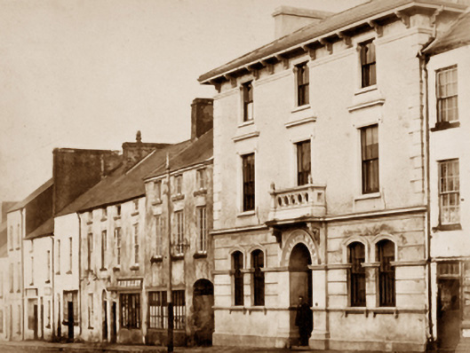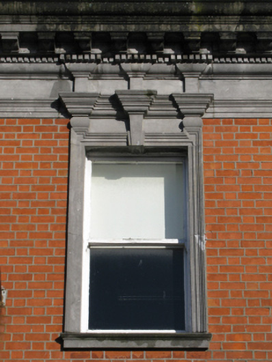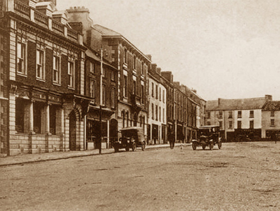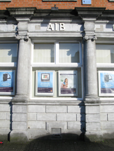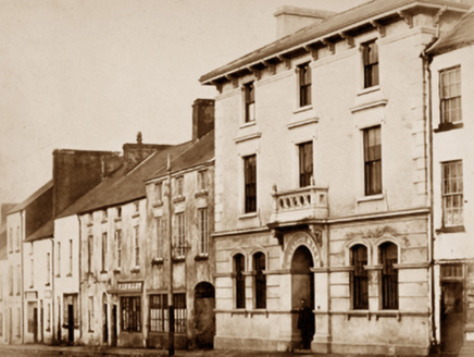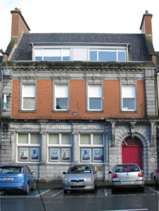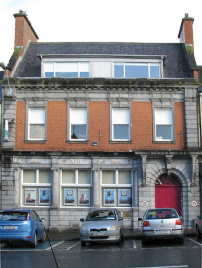 Terraced four-bay two-storey bank with dormer attic, built 1902-3; extant 1911. Pitched slate roof behind parapet centred on flat roof to window opening to dormer attic with roll moulded clay ridge tiles, moss-covered cut-limestone[?] coping to gables with red brick Flemish bond chimney stacks to apexes having dragged cut-limestone stepped capping supporting ribbed terracotta pots, rooflights to rear (north-east) pitch, and concealed rainwater goods retaining "battlemented" cast-iron hoppers and square profile downpipes with cast-iron rainwater goods to rear (north-east) elevation retaining cast-iron downpipes. drag edged rusticated limestone ashlar wall (ground floor) on "Cyma Recta" or "Cyma Reversa" cushion course on plinth with drag edged dragged limestone ashlar channelled piers to ends supporting dentilated "Cyma Recta" or "Cyma Reversa" cornice on pulvinated frieze on entablature; repointed red brick Flemish bond surface finish (first floor) with drag edged dragged limestone ashlar channelled piers to ends supporting modillioned "Cyma Recta" or "Cyma Reversa" cornice on frieze on entablature below iron- or lead-covered parapet. Square-headed window openings (first floor) with drag edged dragged cut-limestone sills, and dragged cut-limestone surrounds centred on keystone below "Cyma Recta"- or "Cyma Reversa"-detailed cornices on pulvinated friezes framing one-over-one timber sash windows. Interior including (ground floor): vestibule with mosaic tiled floor centred on emblem ("PBI"), and moulded plasterwork cornice to ceiling; Classical-style timber surround to door opening into manager's residence framing glazed timber panelled door having sidelights on panelled risers below fanlight; entrance hall-cum-staircase hall including top-lit staircase on a dog leg plan with diagonal timber "match stick" balusters supporting timber banister terminating in timber newels, carved timber surrounds to door openings to landings framing timber panelled doors, and moulded plasterwork cornices to ceilings; (first floor): dining room (north-west) retaining carved timber surround to door opening framing timber panelled door with carved timber surrounds to window openings framing timber panelled shutters on panelled risers, Classical-style chimneypiece, and moulded plasterwork cornice to ceiling; drawing room (south-east) retaining carved timber surround to door opening framing timber panelled door with carved timber surrounds to window openings framing timber panelled shutters on panelled risers, replacement chimneypiece, and moulded plasterwork cornice to ceiling; and (dormer attic): carved timber surrounds to door openings framing timber panelled doors with carved timber surrounds to window openings, and Classical-style chimneypieces. Street fronted with concrete brick cobbled footpath to front.
