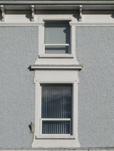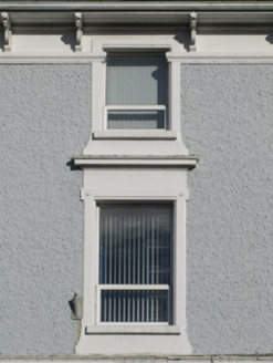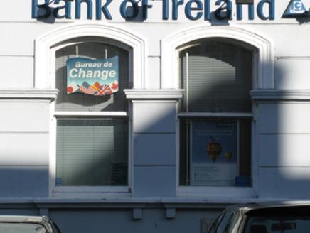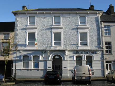 Terraced three-bay three-storey bank, extant 1880, on a T-shaped plan with single-bay (single-bay deep) three-storey lean-to central return (north-east). Refenestrated. Hipped slate roof on a T-shaped plan centred on lean-to slate roof (north-east) with roll moulded clay or terracotta ridge tiles, rendered buttressed chimney stacks having stringcourses below capping supporting terracotta pots, and replacement uPVC rainwater goods on timber eaves boards on slightly overhanging timber boarded box eaves having timber consoles with cast-iron rainwater goods to rear (north-east) elevation on rendered eaves retaining cast-iron octagonal or ogee hoppers and downpipes. Rendered channelled wall (ground floor) on rendered chamfered plinth with "Cavetto"-detailed stringcourse originally centred on balconette on fluted consoles; roughcast surface finish (upper floors) with rusticated quoins to corners supporting blind frieze on "Cavetto" stringcourse. Segmental-headed central open internal porch approached by flight of three dragged cut-limestone steps with moulded rendered archivolt. Paired camber-headed flanking window openings with "Cavetto" sill course on dentil consoles, and concealed dressings with moulded rendered archivolts framing one-over-one timber sash windows. Square-headed window openings (upper floors) with cut-limestone sills, and rosette-detailed rendered surrounds having chamfered reveals supporting thumbnail beaded hood mouldings on blind friezes (first floor) or rendered surrounds having chamfered reveals (top floor) framing replacement uPVC casement windows replacing two-over-two timber sash windows having margins. Street fronted with concrete brick cobbled footpath to front.