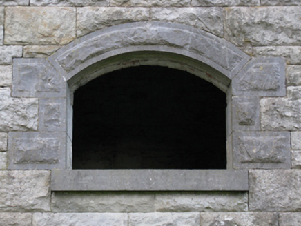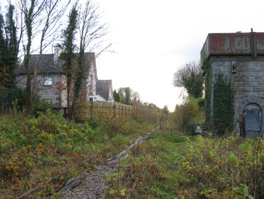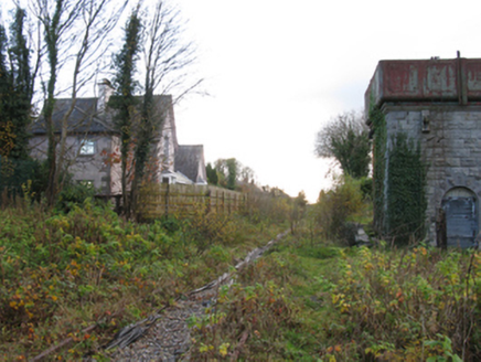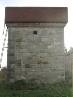Freestanding single-bay single-stage water tower, commissioned 1895; extant 1895, on a square plan. Decommissioned, 1975[?]. Now disused. Part creeper- or ivy-covered tuck pointed coursed or snecked rock faced limestone walls with drag edged rock faced cut-limestone flush quoins to corners supporting cast-iron water tank on dragged cut-limestone thumbnail beaded "cornice". Round-headed door opening (north-east) with overgrown threshold, and drag edged rock faced cut-limestone block-and-start surround with timber boarded or tongue-and-groove timber panelled double doors now boarded up. Segmental-headed window opening (south-west) with drag edged cut-limestone sill, and drag edged rock faced cut-limestone block-and-start surround with no fittings surviving. Set on overgrown tarmacadam platform in grounds shared with Swinford Railway Station.