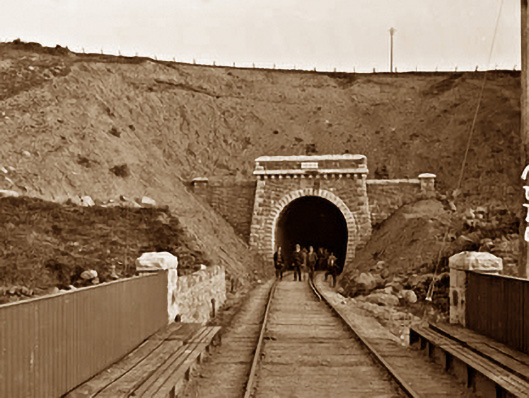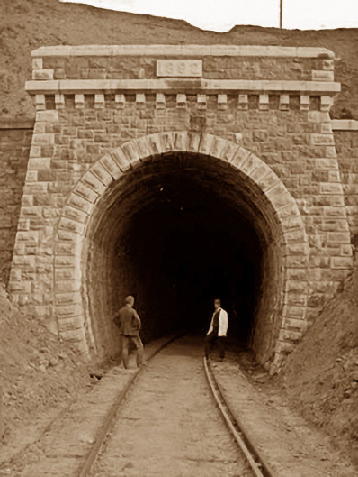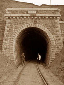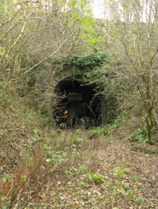 Railway tunnel, dated 1892; opened 1894; extant 1897. Closed, 1934. Reopened, 1936. Closed, 1937. Now disused. North: Tuck pointed snecked rock faced sandstone battered wall with cut-limestone stringcourse on "Cavetto" consoles supporting parapet having rock faced cut-limestone coping centred on tooled cut-limestone date stone ("1892"). Single horseshoe-profile tunnel with drag edged rock faced limestone ashlar voussoirs. Sited spanning uprooted railway line with unkempt embankments to railway line.