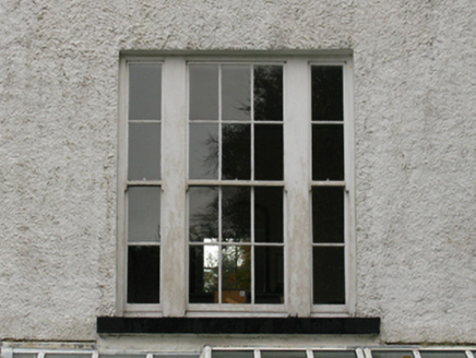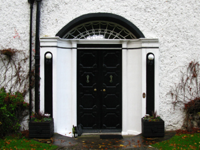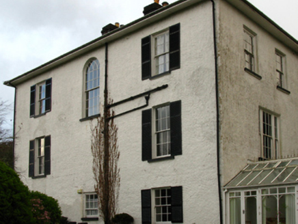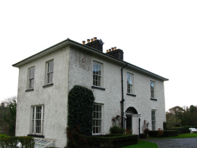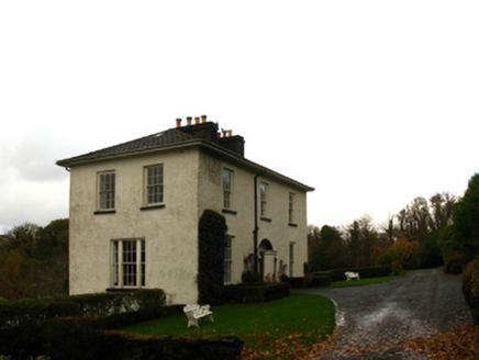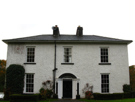 Detached three-bay two-storey over basement Board of First Fruits Church of Ireland glebe house, built 1819, on a symmetrical plan; three-bay full-height rear (north) elevation. Vacant, 1901. Occupied, 1911. Renovated, 1990. Hipped slate roof with clay ridge tiles, paired rendered central chimney stacks having stringcourses below capping supporting terracotta or yellow terracotta pots, rooflights, and cast-iron rainwater goods on slightly overhanging box eaves retaining cast-iron octagonal or ogee hoppers and downpipes. Part creeper-covered roughcast walls. Segmental-headed central door opening with threshold, and doorcase with panelled pilasters centred on reeded engaged colonettes supporting "Cavetto" cornice framing timber panelled double doors having fanlight. Square-headed window openings with drag edged dragged cut-limestone sills, and concealed dressings framing six-over-three-(basement) or six-over-six timber sash windows having part exposes sash boxes. Square-headed window openings in tripartite arrangement (side elevations) with drag edged dragged cut-limestone sills, timber mullions, and concealed dressings framing six-over-six timber sash windows having two-over-two sidelights. Square-headed window openings (first floor) with drag edged dragged cut-limestone sills, and concealed dressings framing six-over-six timber sash windows. Square-headed window openings to rear (north) elevation centred on round-headed window opening (first floor) with drag edged dragged cut-limestone sills, and concealed dressings framing six-over-six timber sash windows having part exposes sash boxes centred on eight-over-twelve timber sash window having interlocking Y-tracery glazing bars. Interior including (ground floor): central hall retaining carved timber surrounds to door openings framing timber panelled doors, moulded plasterwork cornice to ceiling, staircase on a dog leg plan, carved timber surrounds to door openings to landing framing timber panelled doors, and moulded plasterwork cornice to ceiling; drawing room (west) retaining carved timber surround to door opening framing timber panelled door with carved timber surrounds to window openings framing timber panelled shutters on panelled risers, Classical-style chimneypiece, and plasterwork cornice to ceiling; dining room (east) retaining carved timber surround to door opening framing timber panelled door with carved timber surrounds to window openings framing timber panelled shutters on panelled risers, Classical-style chimneypiece, and moulded plasterwork cornice to ceiling; and carved timber surrounds to door openings to remainder framing timber panelled doors with carved timber surrounds to window openings framing timber panelled shutters on panelled risers. Set in landscaped grounds with roughcast piers to perimeter having stepped capping supporting flat iron double gates.