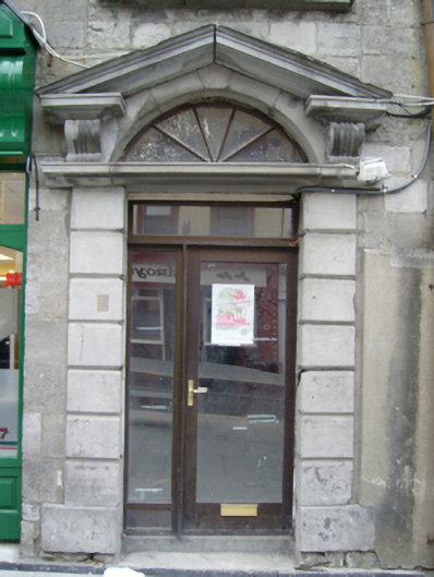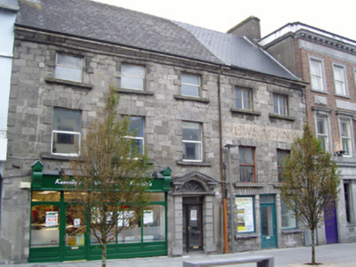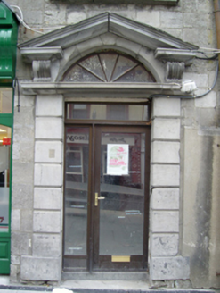 Terraced three-bay three-storey townhouse, extant 1838. Renovated with replacement shopfront inserted to ground floor. One of a pair. Replacement pitched fibre-cement slate roof with ridge tiles terminating in cement rendered chimney stack having concrete capping, and cast-iron rainwater goods on timber eaves boards on dragged cut-limestone "Cyma Recta" or "Cyma Reversa" cornice retaining cast-iron downpipe. Tuck pointed coursed or snecked limestone walls. Segmental-headed door opening with cut-limestone step threshold, and drag edged rusticated cut-limestone surround supporting open bed pediment on fluted consoles framing replacement glazed aluminium door having fanlight. Square-headed window openings (upper floors) with drag edged dragged cut-limestone sills, and drag edged tooled cut-limestone "bas-relief" block-and-start surrounds centred on keystones framing replacement aluminium casement windows replacing one-over-one timber sash windows. Street fronted with flagged footpath to front.