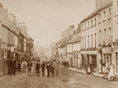 End-of-terrace four-bay two-storey house, extant 1838. Renovated with openings to ground floor remodelled to accommodate continued alternative use. Now disused. Pitched slate roof with clay ridge tiles terminating in rendered chimney stacks having concrete capping supporting yellow terracotta tapered pots, and replacement uPVC rainwater goods on timber eaves board on rendered cut-limestone eaves[?] retaining embossed cast-iron ogee hopper ("183-") and downpipe. Rendered, ruled and lined battered walls over coursed rubble limestone construction with concealed hammered limestone flush quoins to corners. Square-headed window openings (first floor) with cut-limestone sills, and concealed dressings framing one-over-one timber sash windows having part exposed sash boxes. Street fronted with cobbled footpath to front.