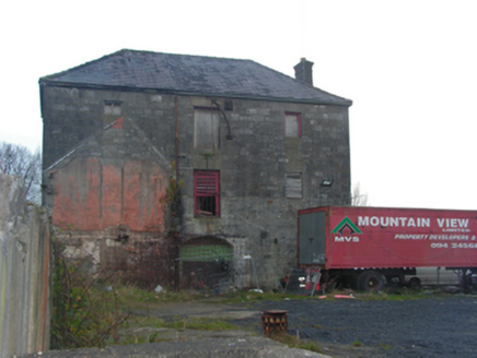 Detached three-bay three-storey warehouse, extant 1895, on a symmetrical plan with three-bay three-storey rear (south) elevation. Now disused. Hipped slate roof on collared timber construction with clay ridge tiles, and no rainwater goods surviving on cut-limestone eaves retaining cast-iron downpipes. Tuck pointed coursed or snecked limestone walls with drag edged tooled cut-limestone flush quoins to corners. Segmental-headed central carriageway between drag edged tooled cut-limestone "Cavetto" corbels with drag edged tooled limestone ashlar voussoirs framing cement rendered infill. Square-headed window openings with drag edged tooled limestone ashlar voussoirs framing concrete block infill. Square-headed central loading door openings to rear (south) elevation with drag edged tooled limestone ashlar voussoirs framing remains of timber doors. Set in unkempt grounds.