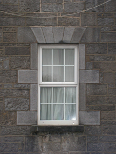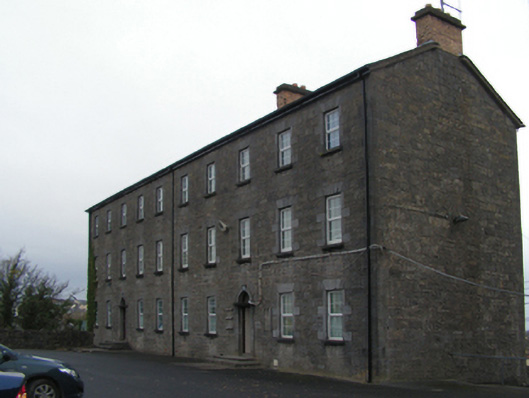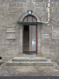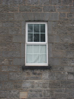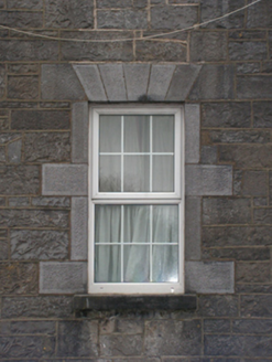 A soldiers' quarters blockhouse originally built as one of four identical units (including 31209066 - 31209067) illustrating the development or redevelopment of the Castlebar Infantry Barracks complex in the early nineteenth century with the architectural value of the composition, 'a fine range…recently erected' (Lewis 1837 I, 289), confirmed by such attributes as the symmetrical plan form centred on streamlined Classical doorcases; the construction in a rough cut limestone offset by "sparrow pecked" dressings demonstrating good quality workmanship; and the uniform or near-uniform proportions of the openings on each floor: meanwhile, aspects of the composition illustrate the near-total reconstruction of the soldiers' quarters blockhouse following an attack (1922) during "The Troubles" (1919-23). Having been reasonably well maintained, the elementary form and massing survive intact together with quantities of the original fabric, both to the exterior and to the interior: the introduction of replacement fittings to most of the openings, however, has not had a beneficial impact on the character or integrity of the composition.