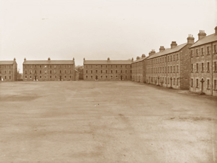 Detached ten-bay three-storey over basement soldiers' quarters blockhouse, sanctioned 1828; under construction 1831; extant 1838, on a symmetrical plan with six-bay full-height rear (east) elevation. Burnt, 1922. Restored, 1927-34. In alternative use, 1995. Refenestrated. Now disused. One of a group of three. Pitched slate roof with clay or terracotta ridge tiles, yellow brick English Garden Wall bond chimney stacks centred on yellow brick English Garden Wall bond chimney stacks having cut-limestone stringcourses below capping supporting terracotta or yellow terracotta pots, and replacement uPVC rainwater goods on eaves boards on cut-limestone eaves. Part creeper- or ivy-covered repointed tuck pointed coursed or snecked limestone walls with drag edged tooled cut-limestone flush quoins to corners. Segmental-headed central door openings with benchmark-inscribed drag edged tooled cut-limestone block-and-start surrounds centred on keystones framing replacement timber panelled doors having overlights. Square-headed window openings with cut-limestone sills, and drag edged tooled cut-limestone block-and-start surrounds framing replacement uPVC casement windows replacing six-over-six timber sash windows. Interior including (ground floor): central halls retaining limestone flagged floors. Set in shared grounds with tarmacadam parade ground.