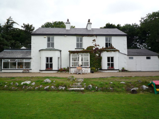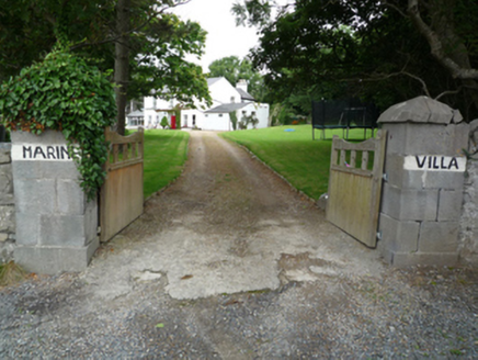 Detached three-bay two-storey house, extant 1897, on a T-shaped plan with single-bay (single-bay deep) full-height central return (north). Refenestrated, ----. For sale, 2013. Pitched slate roof on a T-shaped plan with clay ridge tiles, paired rendered central chimney stacks having stringcourses below capping supporting crested square profile pots, and cast-iron rainwater goods on box eaves retaining cast-iron downpipes. Part creeper- or ivy-covered rendered, ruled and lined walls with rusticated rendered quoins to ends. Square-headed central door opening with concealed dressings framing replacement glazed timber door having overlight. Square-headed window openings with cut-limestone sills, and concealed dressings framing replacement timber casement windows replacing two-over-two timber sash windows. Interior including (ground floor): central hall retaining staircase with turned timber balusters supporting carved timber banister terminating in volute. Set in landscaped grounds with drag edged tooled limestone ashlar piers to perimeter having ivy-covered cut-limestone pyramidal capping.