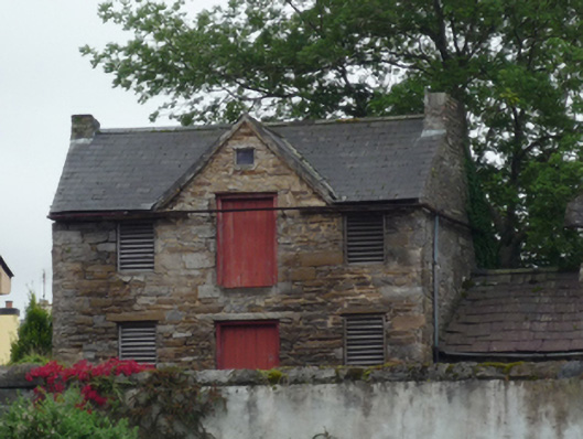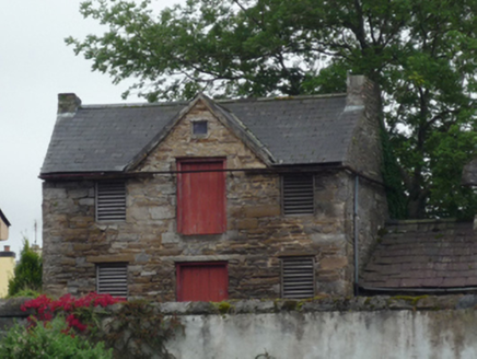 Detached three-bay two-storey grain store or warehouse with half-attic, extant 1838, on a rectangular plan. Now disused. Pitched slate roof centred on pitched (gabled) slate roof, clay ridge tiles, abbreviated chimney stacks, and cast-iron rainwater goods on rendered cut-limestone eaves retaining cast-iron downpipes. Part creeper- or ivy-covered walls with rough hewn flush quoins to corners. Elliptical-headed central carriageway with cut-limestone voussoirs framing timber boarded double doors. Square-headed loading openings (upper floors) with rough hewn lintels framing timber boarded doors. Square-headed flanking window openings with rough hewn lintels framing louvered timber fittings. Set back from street in shared grounds.