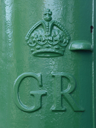 Freestanding cast-iron "pillar box" post box, between 1910-22; extant 1924, with "GR [Georgius Rex]" royal cipher. Set on concrete footpath.
