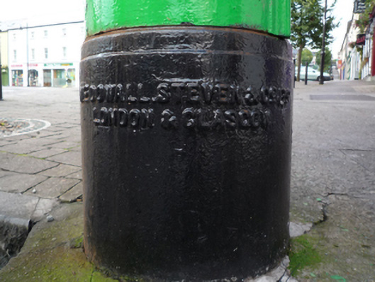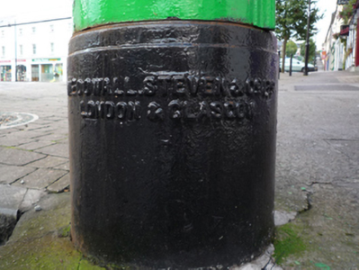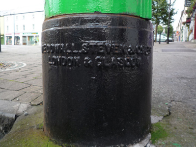 A "pillar box" post box supplied by McDowall Steven and Company (fl. 1828-1930) of London and Glasgow representing an interesting example of mass-produced cast-iron work making a pleasing, if largely inconspicuous visual statement in an urban street scene with embellishments identifying the artistic potential of the composition including the King George V (1865-1936; r. 1910-22) royal cipher of additional significance as an imprinted reminder of the period when Ireland formed part of the British Empire.