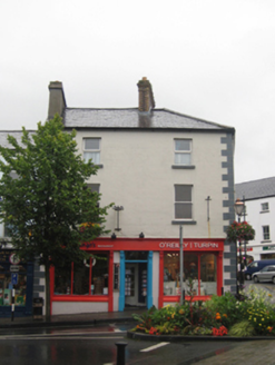 End-of-terrace two-bay three-storey house, extant 1838[?], originally two separate single-bay three-storey houses with shopfront to ground floor; three-bay three-storey side (south) elevation. Renovated. Pitched and hipped slate roof on an L-shaped plan with clay ridge tiles, rendered chimney stack (north) with red brick Common bond chimney stack (south) having chevron- or saw tooth-detailed corbelled stepped stringcourse below capping supporting yellow terracotta pots, and cast-iron rainwater goods on rendered eaves retaining cast-iron downpipes. Rendered, ruled and lined walls with rusticated rendered quoins to corners. Timber shopfront to ground floor on a symmetrical plan. Square-headed window openings (upper floors) with cut-limestone sills, and concealed dressings framing one-over-one timber sash (first floor) or replacement uPVC casement (top floor) windows. Interior including (upper floors): carved timber surrounds to door openings framing timber panelled doors with timber panelled shutters to window openings. Street fronted on a corner site with concrete brick cobbled footpath to front.