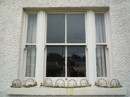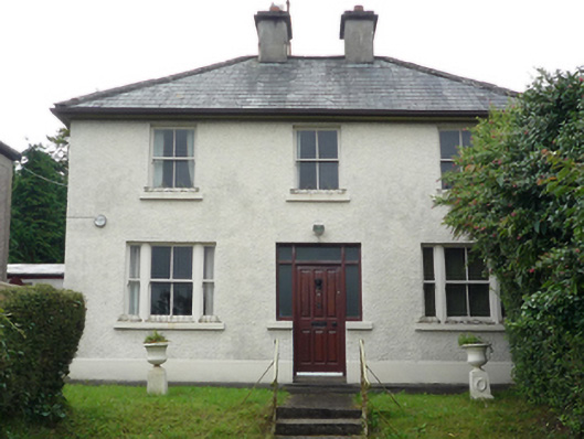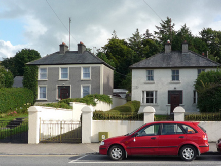 Detached three-bay two-storey house, built 1938, on a rectangular plan. Now disused. One of a pair. Hipped slate roof with concrete ridge tiles, paired rendered central chimney stacks having stepped capping supporting terracotta pots, and replacement uPVC rainwater goods on timber eaves boards on rendered eaves retaining cast-iron octagonal or ogee hoppers and downpipes. Roughcast walls on rendered plinth. Hipped square-headed central door opening with timber mullions on concrete step threshold supporting timber transom, and concealed dressings framing timber panelled door having sidelights below overlight. Square-headed window openings including square-headed window openings in tripartite arrangement (ground floor) with concrete sills, and concealed dressings framing two-over-two timber sash windows having one-over-one sidelights (ground floor). Set back from street in landscaped grounds on a slightly elevated site with rendered piers to perimeter having segmental capping supporting wrought iron gate.