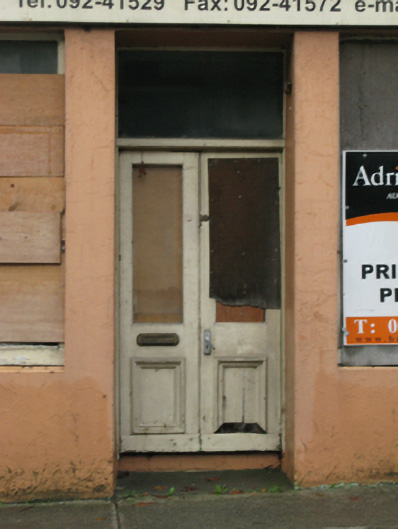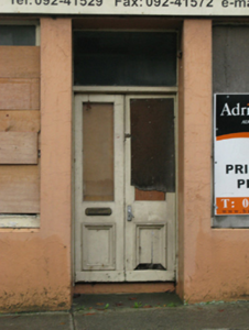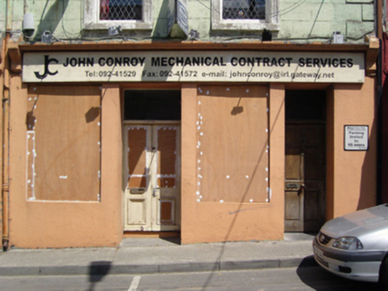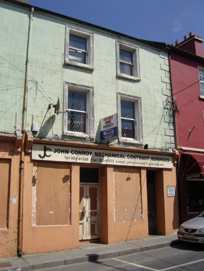 A dishevelled house erected as one of a pair (including 31215018) representing an integral component of the early twentieth-century built heritage of Ballinrobe with the architectural value of the composition suggested by such traits as the compact near-square plan form; and the diminishing in scale of the openings on each floor producing a graduated visual effect with those openings showing sleek "stucco" refinements. A prolonged period of neglect notwithstanding, the elementary form and massing survive intact together with substantial quantities of the original fabric including a shopfront on modest artistic interest making a pleasing visual statement in the streetscape at street level.