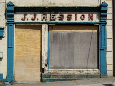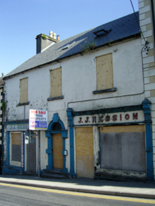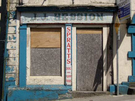 Terraced three-bay two-storey house with dormer attic, extant 1838, on a symmetrical plan with pair of shopfronts to ground floor. In use, 1990. Reroofed. For sale, 2009. Now disused. Replacement pitched artificial slate roof on wind braced timber construction with pressed ridges terminating in rendered chimney stack having stringcourse below capping supporting terracotta or yellow terracotta tapered pots, paired rooflights to front (south) pitch, and cast-iron rainwater goods on rendered cut-limestone eaves retaining cast-iron downpipe. Rendered, ruled and lined walls on rendered chamfered plinth with rusticated rendered pier to end. Round-headed central door opening approached by two drag edged tooled cut-limestone steps with drag edged dragged cut-limestone block-and-start surround centred on fluted double keystone framing glazed timber panelled door having overlight. Timber shopfront to left ground floor. Rendered shopfront to right ground floor. Square-headed window openings (first floor) with drag edged dragged cut-limestone sills, and concealed dressings framing two-over-two timber sash windows. Interior including (ground floor): central entrance hall-cum-staircase hall retaining timber surrounds to door openings framing timber panelled doors, staircase on a dog leg plan with timber "match stick" balusters supporting timber banister terminating in timber newel, and run moulded plasterwork cornice to ceiling; (first floor): fittings now missing. Street fronted with concrete footpath to front.