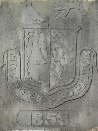 Wall-mounted cut-limestone coat-of-arms, dated 1858. Set in limestone ashlar wall having lichen-covered cut-limestone rounded coping.