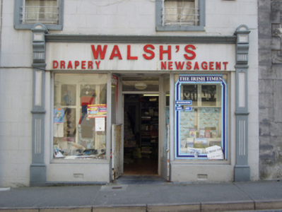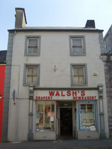 Attached two-bay three-storey house, extant 1894, with shopfront to ground floor. Pitched slate roof with clay ridge tiles terminating in rendered chimney stacks having concrete capping supporting terracotta pots, and replacement uPVC rainwater goods on rendered cut-limestone eaves retaining cast-iron downpipe. Rendered, ruled and lined wall to front (west) elevation with rusticated rendered piers to ends; cement rendered surface finish (remainder). Rendered shopfront to ground floor on a symmetrical plan. Square-headed window openings (upper floors) with rendered sills, and moulded rendered surrounds framing one-over-one timber sash windows having part exposed sash boxes. Interior including (upper floors): timber surrounds to door openings framing timber panelled doors with timber panelled shutters to window openings. Street fronted with concrete footpath to front.